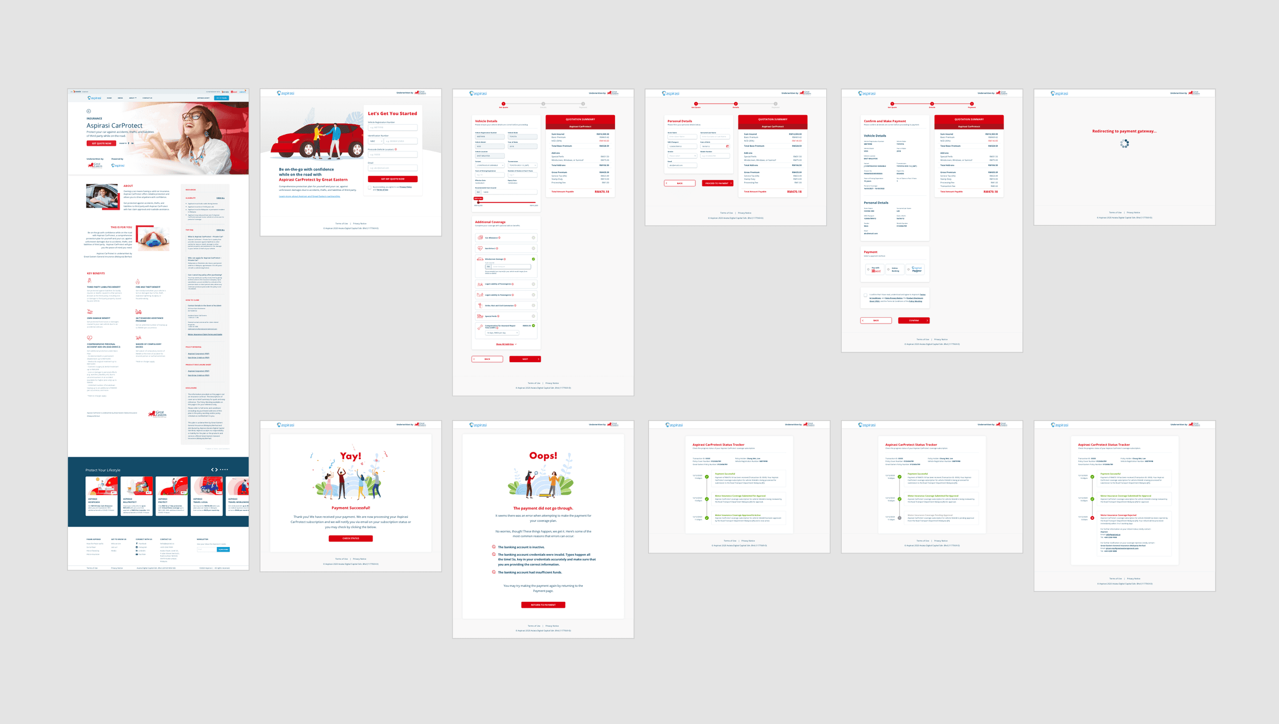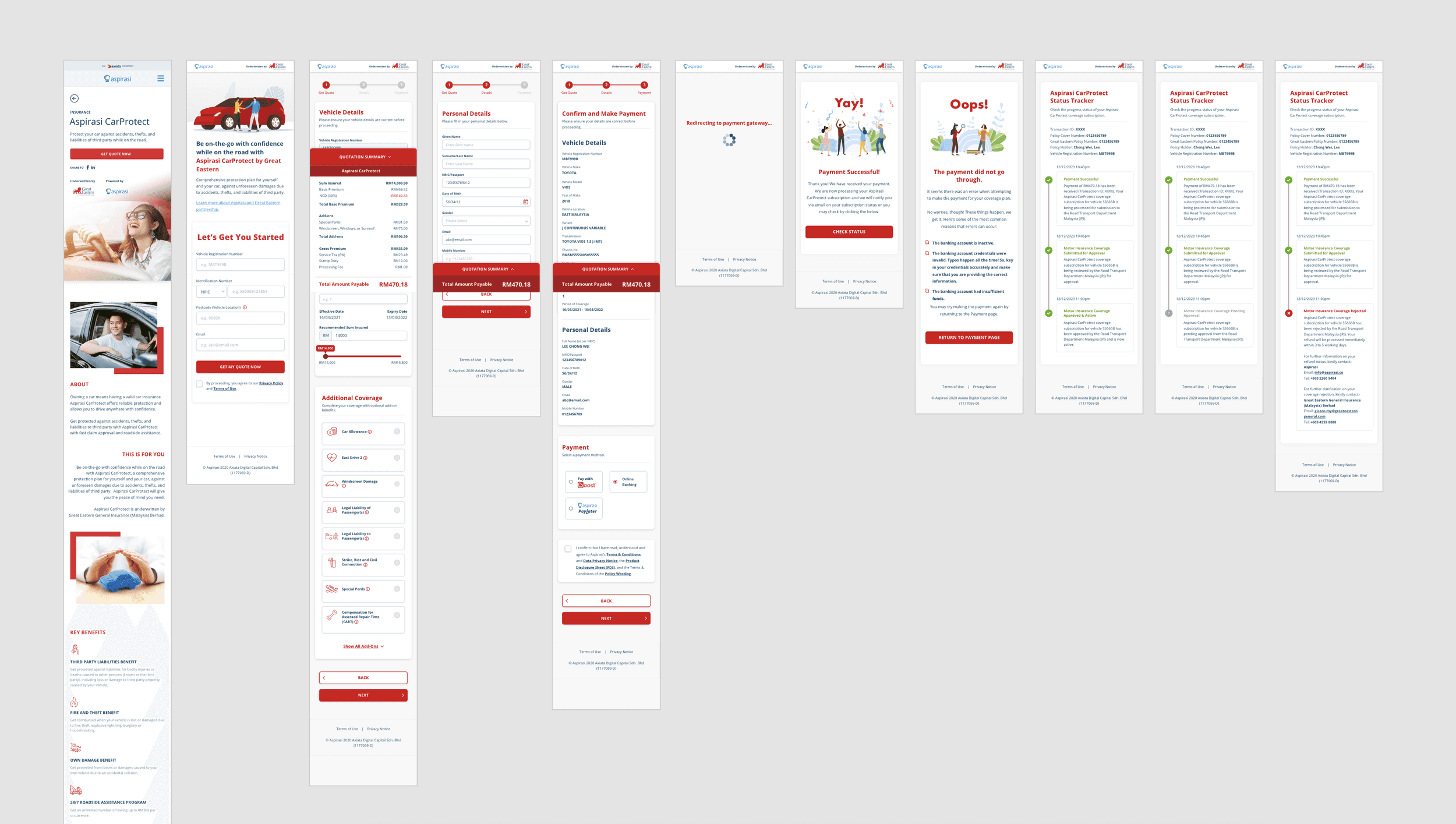 CarProtect was a more comprehensive purchasing insurance journey; which was quite a step up from the other digital insurance products I’ve worked on in Aspirasi Axiata. I did an extensive market research and competitive analysis on various motor insurance journeys to gain better insights into the process in line with understanding our business requirements and insurance regulations. I delved deep into understanding how customers navigate the purchasing process, from obtaining quotes to comparing add-on coverage options and eventually completing the purchase journey.
