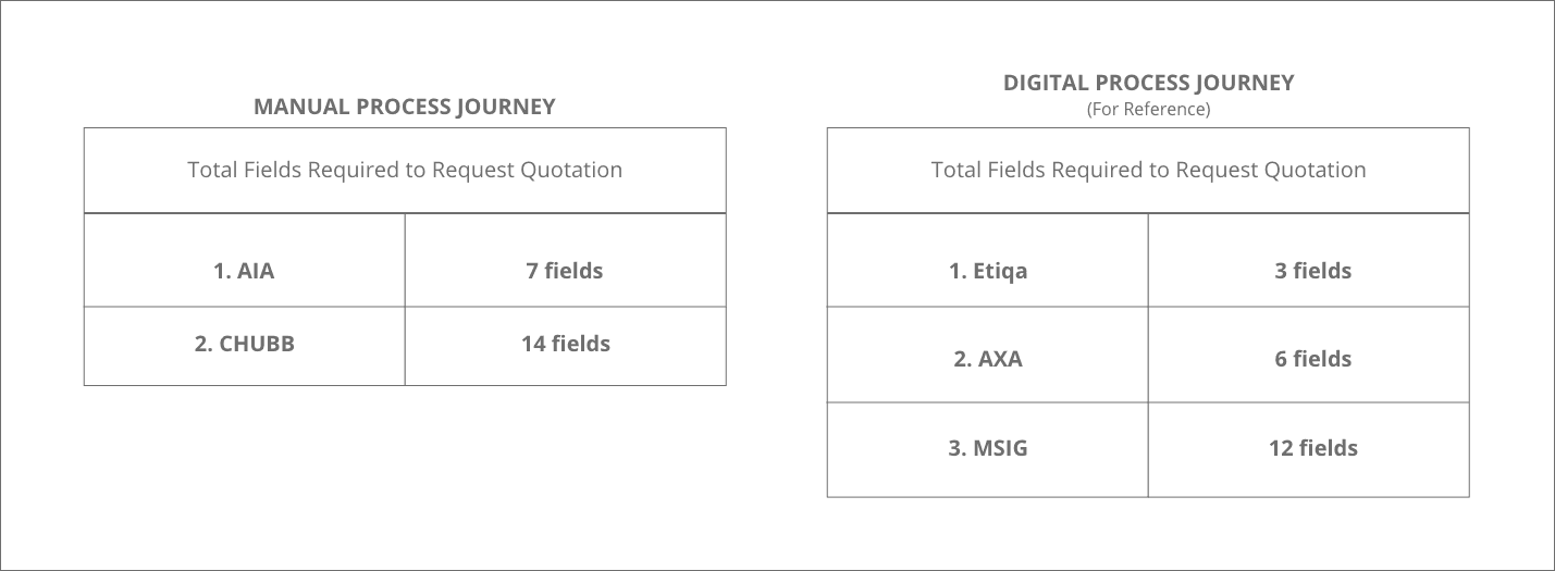 I then narrowed down my analysis to 5 insurance providers and segregated them to 2 different categories based on their purchasing journey (i.e. Hybrid Manual+Digital Journey and Full Digital Journey).
