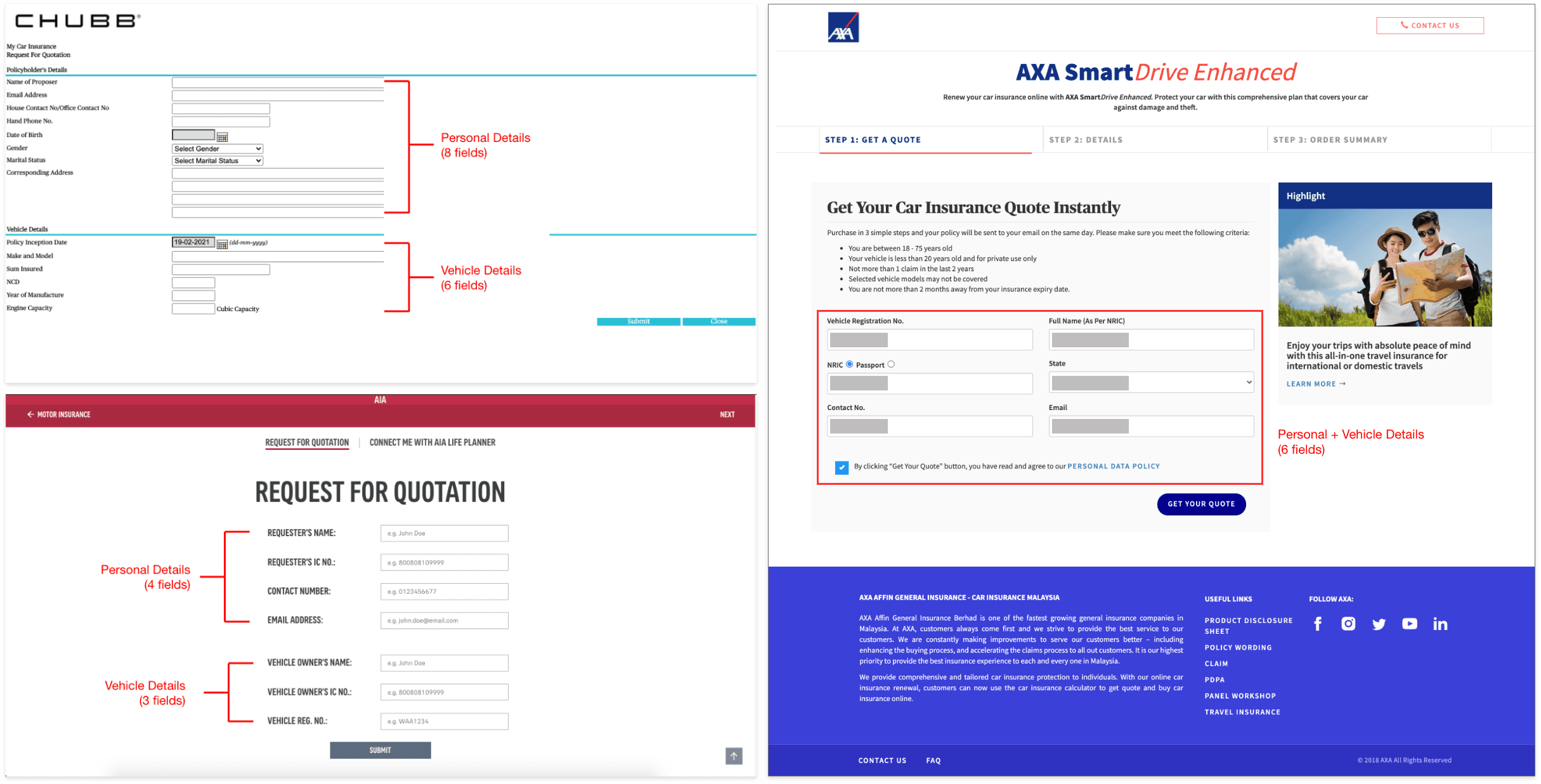 I needed to study the different competitors in the market and the extent of basic user information that was required before a price quotation could be generated. I researched 10 insurance providers as well as 3 insurance aggregators. I studied: